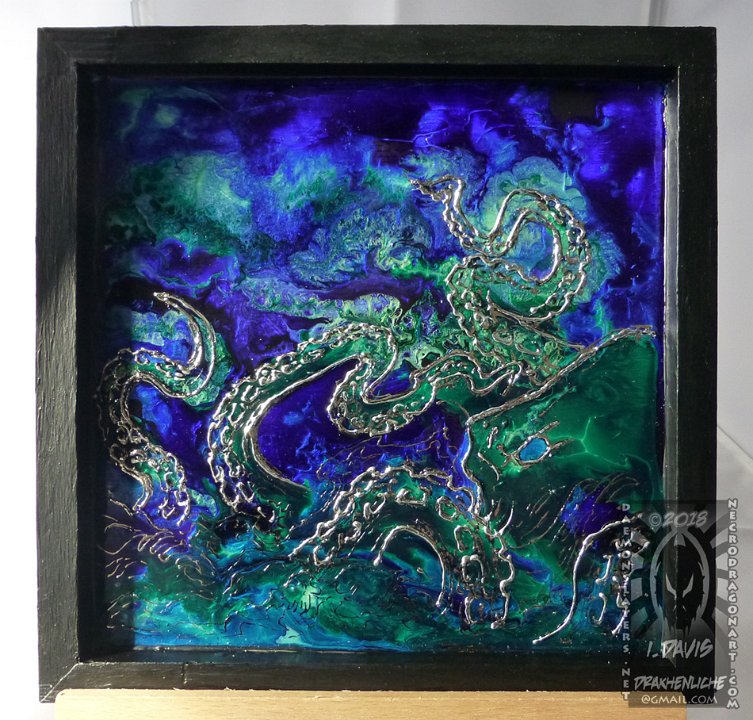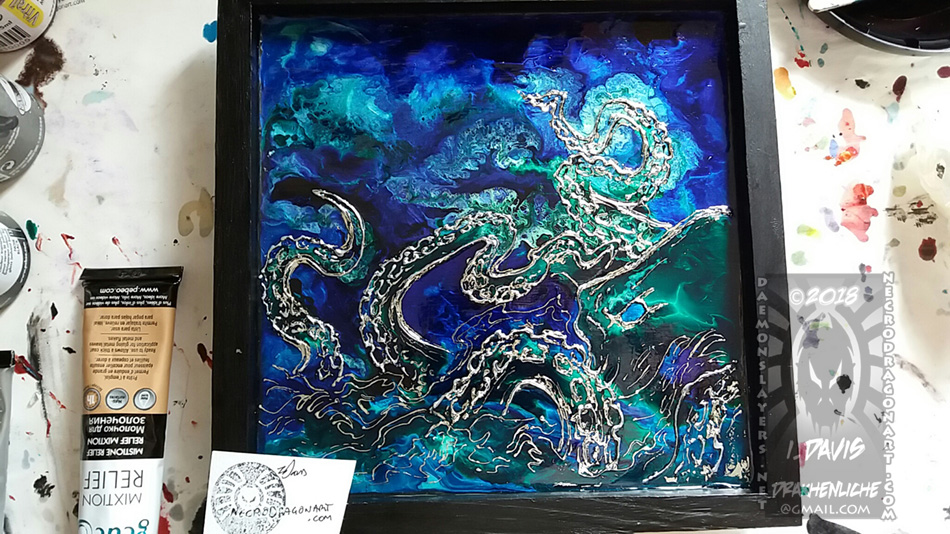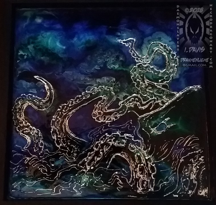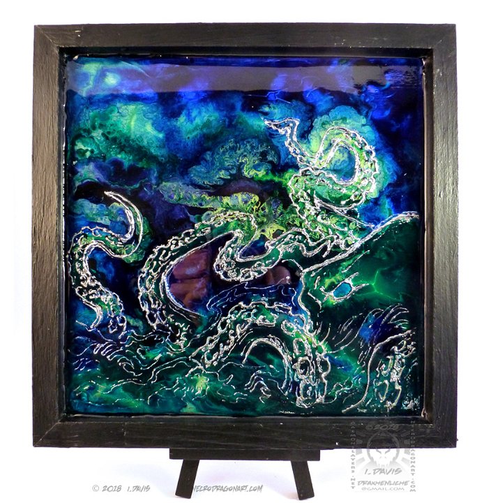 kraken03 kraken04 mixedmedia kraken  20 x 20cm wooden panel.  Tentacles  Tricky to photograph, this one - those outlines are silver effect leaf but also there's a layer of glazing resin which makes this super shiney... hence why you can see my skinny fingers reflected as I hold my camera!