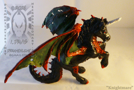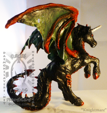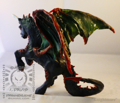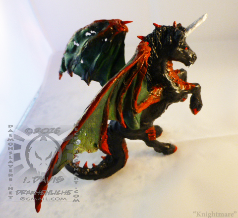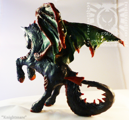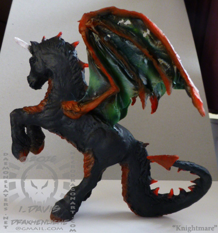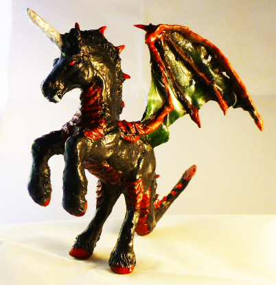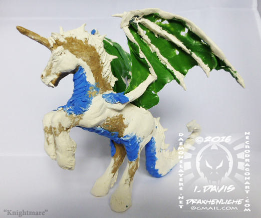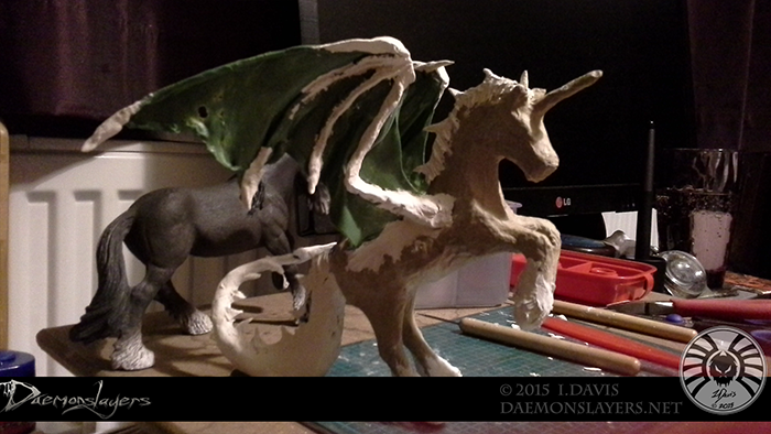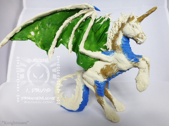 knightmare 11 Knightmare model 02  Project: "I dont' know what I'm doing. 2" Materials: Decopatch extra small 'unicorn' blank figure, strong wire, glue gun, Kneadatite, Paperclay, Silk Clay (though not at this photo's stage yet)  Project link:  "The Daemonslayers"  Character:  knightmare   Using more Paperclay: built up the mane some more, further work on wing structure, tail and added some spikes.  In hindsight I should have used Silk Clay for the spines - it is slightly more flexible once dried so less likely to break off should anything untoward occur. In the background there is a Papo horse I was using for reference.  Originally I was going to try and do a figure conversion using him but I didn't think my skill level was really up to it, hence the use of the far more basic, less detailed Decopatch blank. : knightmare, daemonslayers, model, modelling, sculpture, clay, paperclay, silk clay, 3d, oc, original character, dire unicorn, unicorn, alicorn, unidragon, horse, creature, progress image Knightmare Model 01  Project: "I dont' know what I'm doing. 2" Materials: Decopatch extra small 'unicorn' blank figure, strong wire, glue gun, Kneadatite, Paperclay, Silk Clay (though not at this photo's stage yet)  Project link:  "The Daemonslayers"  Character:  knightmare   I had rather a lot of fun with this. Started with a 'extra small' size Decopatch unicorn blank figure.  Pierced through with some thick wire to make the wing base structure, same for the tail. Built up the form with more wire on the wings and lots of hot glue using my trusty glue gun.  I ought to have taken some photos at that stage but didn't think to. Once that was all dried I made the wing membranes out of Kneadatite (Green stuff, to modellers). There's probably better substances to make membranes out of - really I was making this up as I went along.  At this stage, where I finally remembered to start taking photos, I've started using 'Paperclay' which is an air-drying clay to start making Knightmare look like himself. I've never used it before but it was mess-free and reasonably easy to handle.  So built up the wing structure with it, filled out his tail, tried to add some definition to his legs and started on his mane. : knightmare, daemonslayers, model, modelling, sculpture, clay, paperclay, silk clay, 3d, oc, original character, dire unicorn, unicorn, alicorn, unidragon, horse, creature, progress image knightmare 00  Project: "I dont' know what I'm doing. 2" Materials: Decopatch extra small 'unicorn' blank figure, strong wire, glue gun, Kneadatite, Paperclay, Silk Clay. Project link:  "The Daemonslayers"  Character:  knightmare   More detail with the Paperclay - here I've started to add some definition to the blank's featureless, somewhat misshapen head.  Something that really bugs me is the horn - it's too chunky but under the paper is a plastic core and I was reluctant to try and whittle it down with a knife when the idea finally occurred to me that I could as the wings and tail were already on and I didn't want to risk breaking them if I got a bit cackhanded about it. The blue stuff forming his armour plating is silk clay.  It's really aimed at children but is easy and convenient to use, takes paint ok and in future I think I'll use it for horns and spikes and stuff because it's slightly supple when dried so less likely to snap off.  I couldn't find much online about the stuff on how it is long term, but I'm not exactly making gallery masterpieces here, am I?